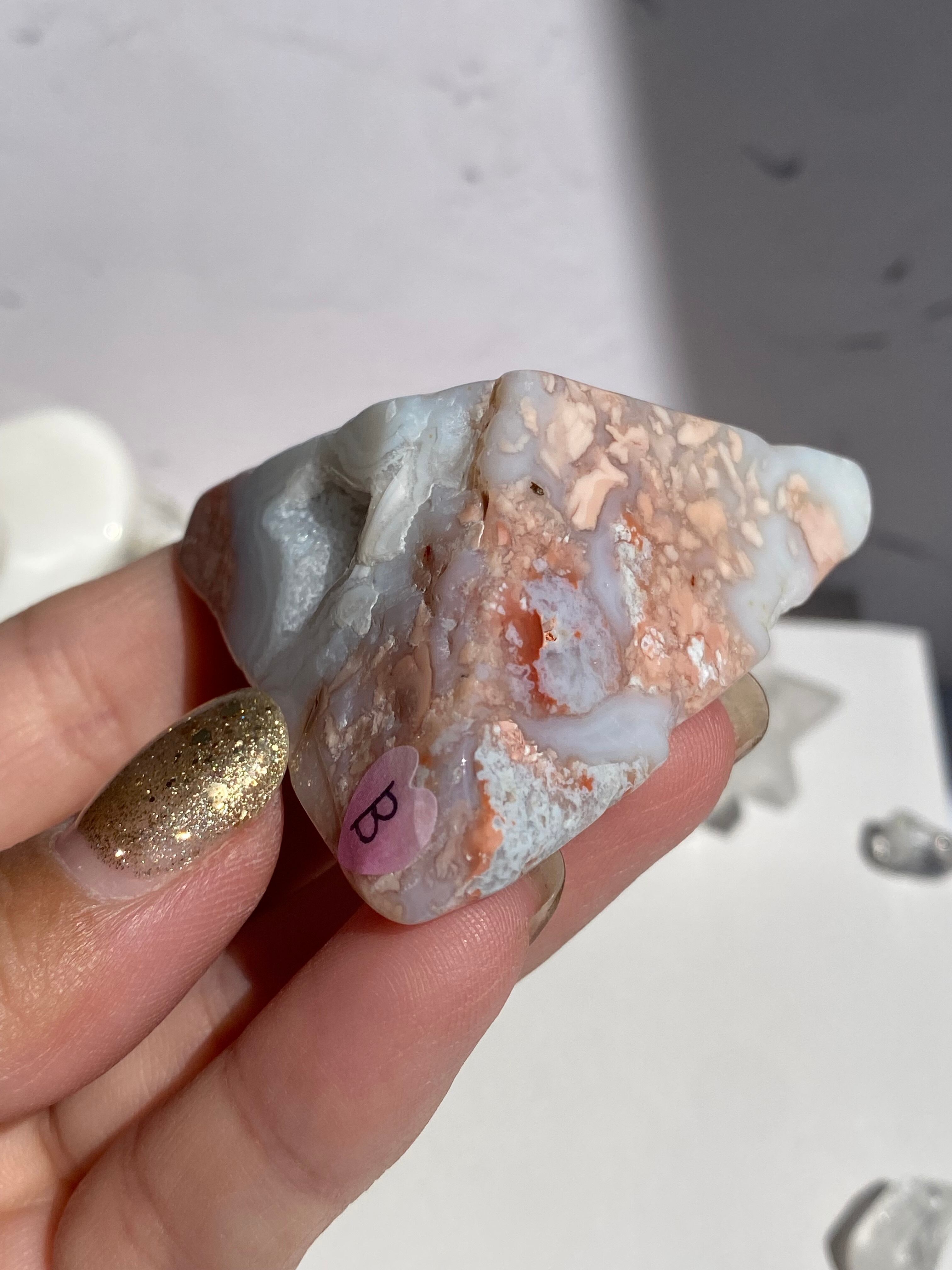 ジオードがあったり、クォーツと共生があったり、透明感のある様なアゲート部分が可愛かったり、ピンクやホワイトが多めなど〜それぞれ特徴があってキュート♡