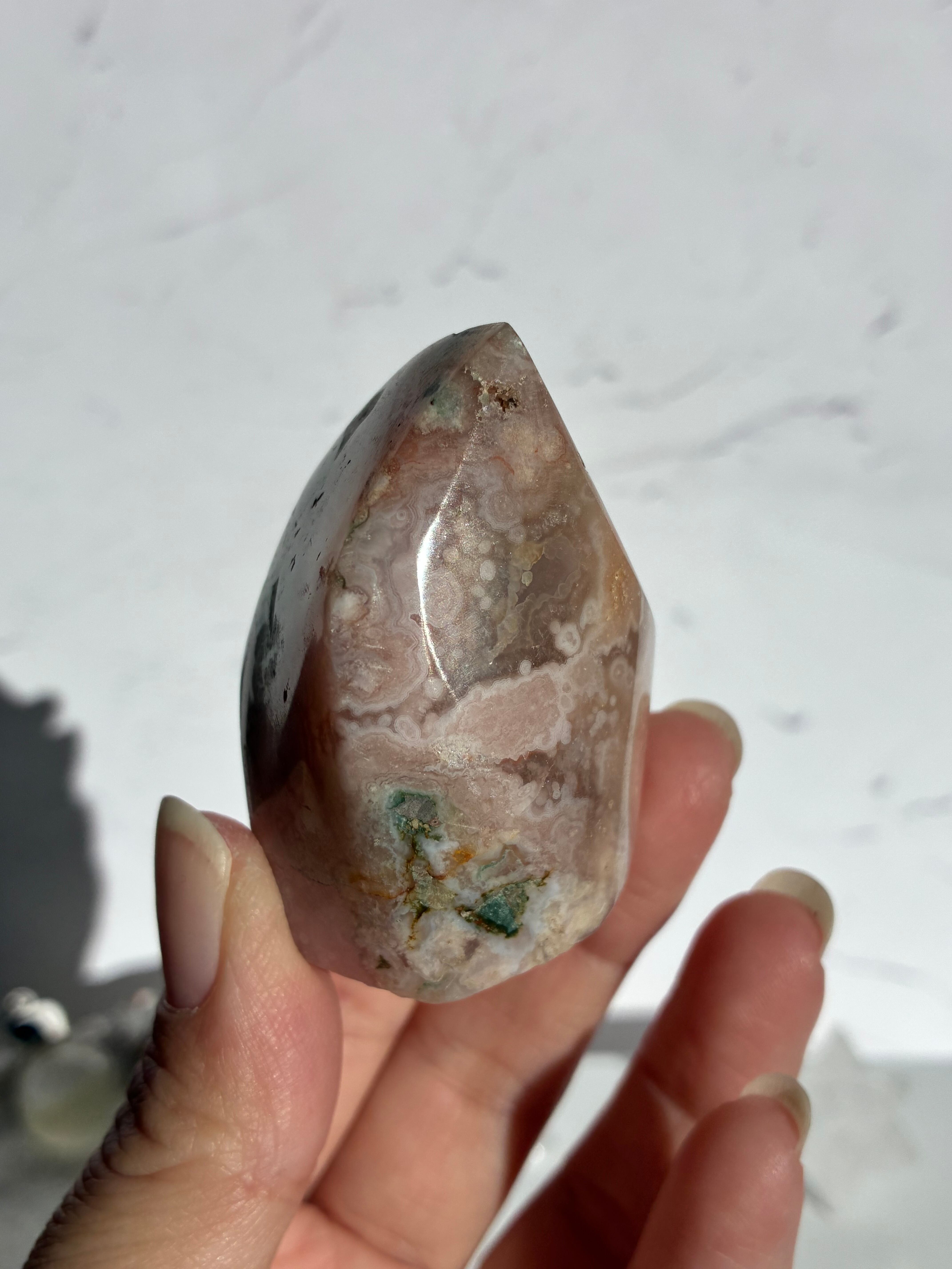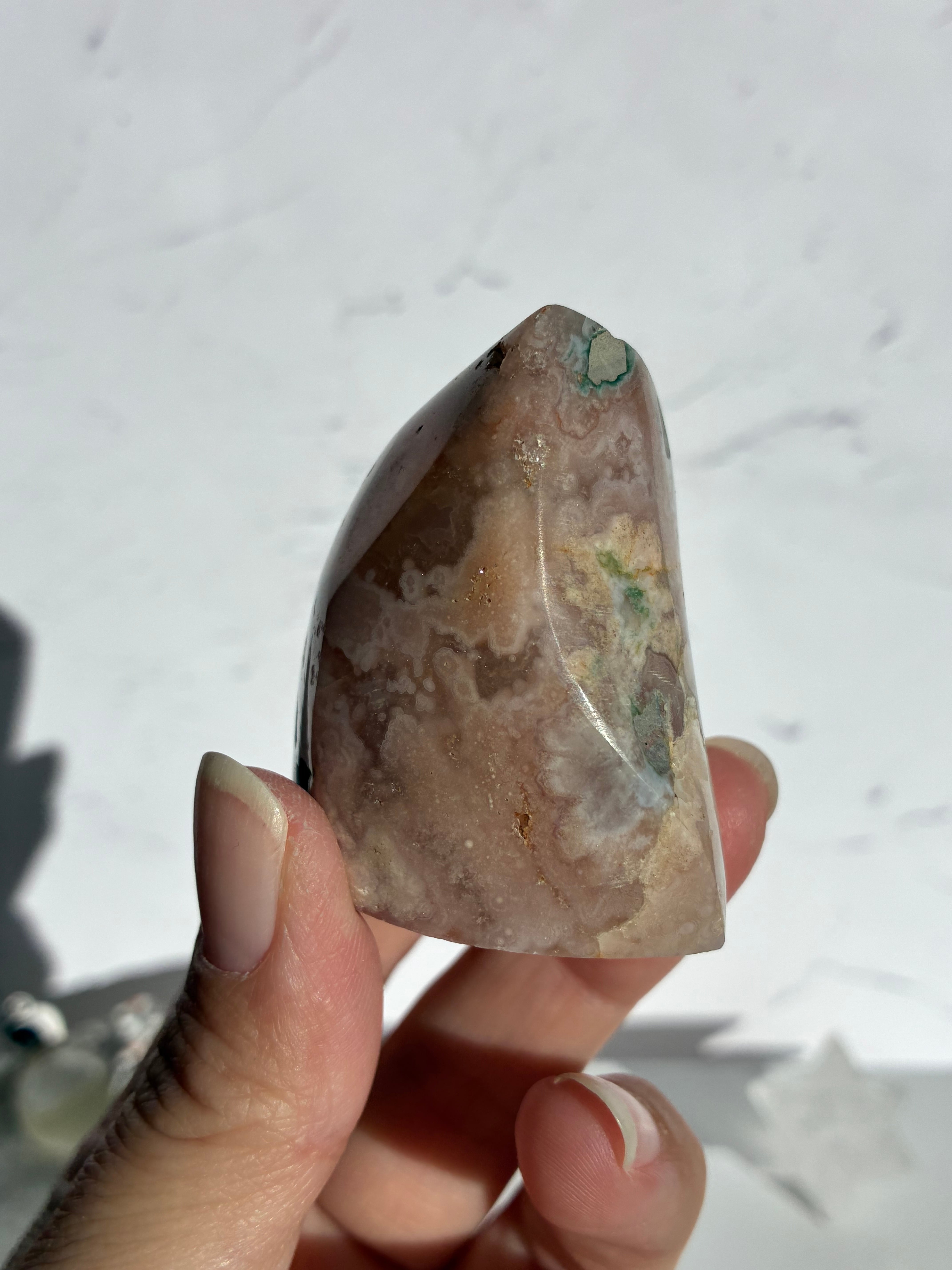 母岩のグリーンが入っていたり、チラりと感じられる結晶になっている部分、水玉模様やお花模様、沢山の可愛いいがみられます♪