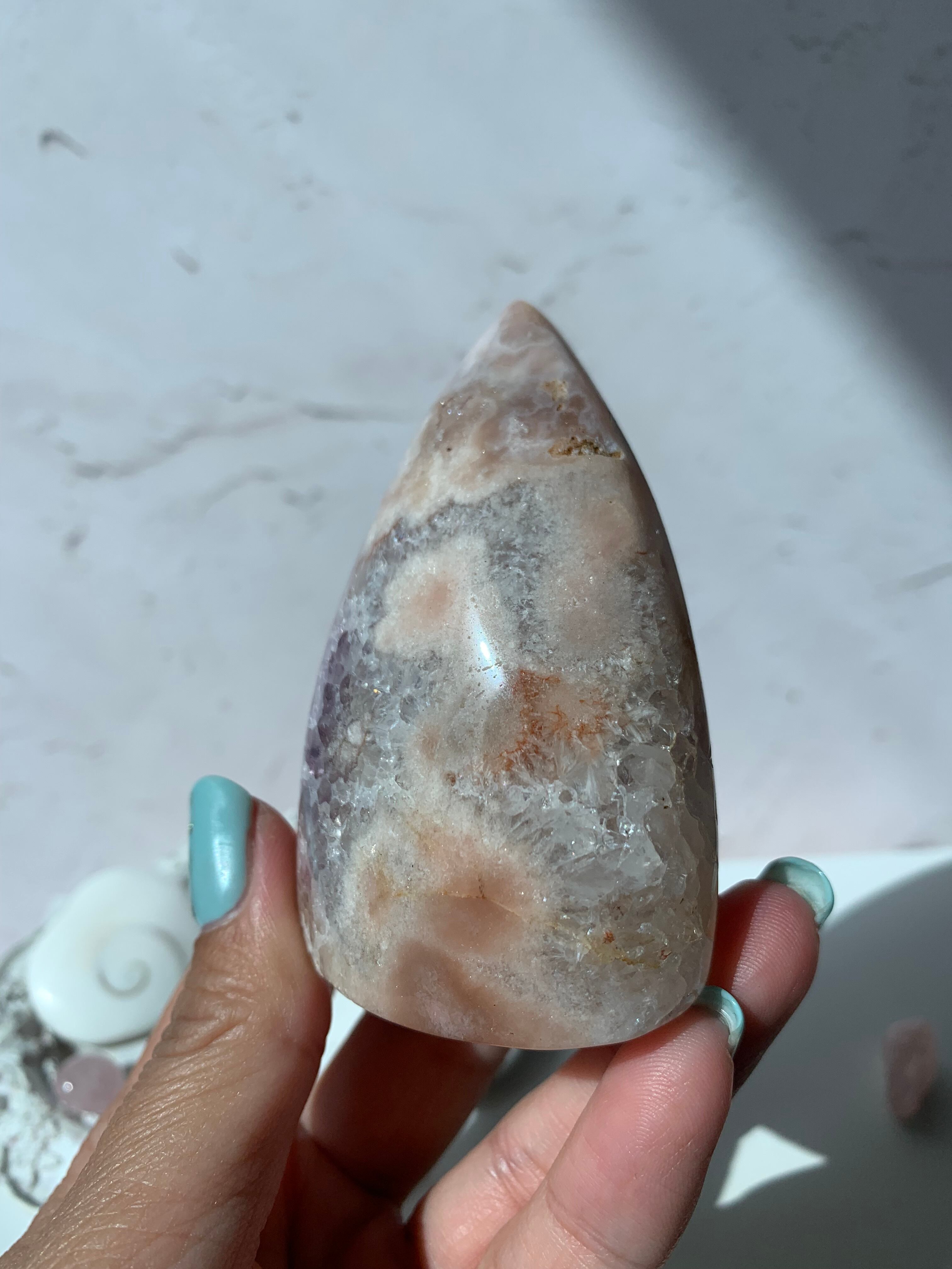 三角の形をしていて丸いフォルムが可愛らしく、虹が沢山キラキラします。ザクザクな結晶が最高に美しいです。薄く入るアメジストの紫がキュンなポイント♡