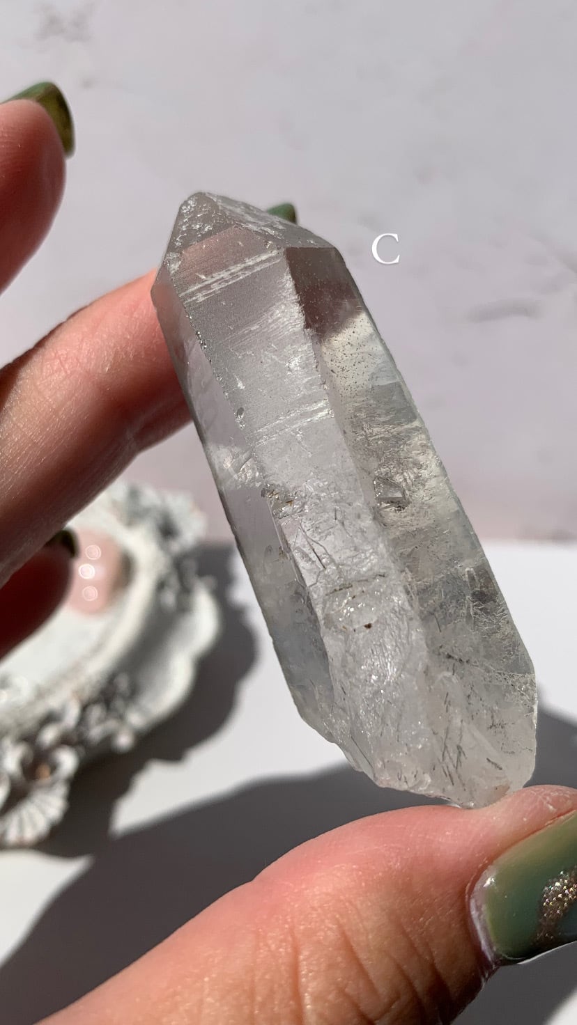 クリアな色味。ノーマルの水晶と比べるとほんのりブルーグレーがかっています。針状の内包物がちらほらと少し内包されています。成長痕もしっかり見え、柱の面が面白く三角△マークがあります。